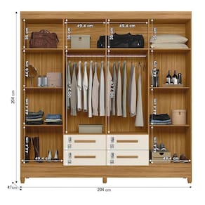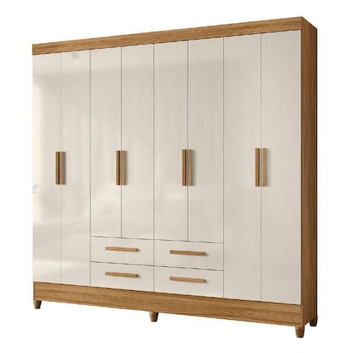A Esplanada Móveis se responsabiliza pela dos produtos adquiridos até a porta de entrada ou portaria do endereço indicado, se a portaria do condomínio permitir, as s são efetuadas no piso térreo e é de responsabilidade do cliente a locomoção da mercadoria até seu apartamento ou casa. MEDIDAS:: A = 204 cm L = 204 cm P = 47 cm | MEDIDAS DOS PÉS:: A = 05 cm L = 10 cm P = 04 cm | PESO DO PRODUTO:: 116,90 kg | PESO SUPORTADO:: 78 kg | PRATELEIRAS SUPORTAM ATÉ:: 6kg | GAVETAS SUPORTAM ATÉ:: 6 kg | CABIDEIROS SUPORTAM ATÉ:: 6kg | MODELO:: Guarda Roupas Casal 8 Portas 4 Gavetas Flórida | MARCA:: Moval | COR:: Freijó/Off White | PINTURA:: UV | ACABAMENTO:: Fosco | MATERIAL DA ESTRUTURA:: MDP | ESPESSURA DO MATERIAL DA ESTRUTURA:: 12MM | PORTAS:: 8 | TIPO DE PORTA:: Bater | DOBRADIÇAS:: Aço | GAVETAS:: 4 | CORREDIÇAS:: Aço | PRATELEIRAS:: 4 prateleiras, 4 maleiros | CABIDEIROS:: 2 | MATERIAL DO CABIDEIRO:: Alumínio | PUXADORES:: Sim, 12 puxadores | MATERIAL DOS PUXADORES:: PVC | QUANTIDADE DE PÉS:: 6 | MATERIAL DOS PÉS:: PVC | GARANTIA:: 3 Meses | DIFERENCIAL:: 8 portas, 4 gavetas para melhor armazenamento, amplo espaço interno, acabamento fosco. | ITENS INCLUSOS:: 1 Guarda Roupa, 1 Manual de montagem, 1 Kit Parafusos. | INSTRUÇÕES E CUIDADOS:: Para maior durabilidade, recomendável que a limpeza dos móveis seja feita com pano limpo e levemente umedecido em água e sabão neutro. Em seguida, deverá ser passado um pano limpo e seco. | AVISO:: A Esplanada Móveis se responsabiliza pela dos produtos adquiridos até a porta de entrada ou portaria do endereço indicado, se a portaria do condomínio permitir, as s são efetuadas no piso térreo e é de responsabilidade do cliente a locomoçã | PRODUTO:: Guarda Roupa Casal Cor: Freijo Off