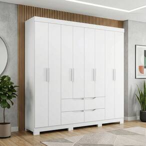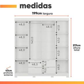 MEDIDAS: A = 217 cm L = 199 cm P = 47 cm MEDIDAS PÉS: A = 5 cm L = 10 cm P = 5 cm PRATELEIRAS SUPORTAM ATÉ: 5 kg CABIDEIROS SUPORTAM ATÉ: 5 kg GAVETAS SUPORTAM ATÉ: 5 kg PESO SUPORTADO: 80 kg PESO BRUTO: 123,8 kg MODELO: Guarda Roupas Casal 8 Portas 4 Gavetas Mirage MARCA: Albatroz MATERIAL DA ESTRUTURA: MDP ESPESSURA DO MATERIAL DA ESTRUTURA: 12 e 15mm PINTURA: UV, alta qualidade ACABAMENTO: Fosco PORTAS: 8 TIPO DE PORTA: Bater DOBRADIÇAS: Metálica PUXADORES: 8 TIPO DE PUXADORES: Alça e cava MATERIAL DOS PUXADORES: MDF revestido GAVETAS: 4 CORREDIÇAS: Telescópicas, abertura suave PRATELEIRAS: 6 CABIDEIROS: 2 MATERIAL DO CABIDEIRO: Alumínio PÉS: 8 MATERIAL DOS PÉS: Plástico DIFERENCIAIS: Design moderno e elegante / Amplo espaço para melhor armazenamento / 6 amplas prateleiras / 4 gavetas com corrediças telescópicas / Pés elevados que facilitam a limpeza. ITENS INCLUSOS: 1 guarda roupas, 1 manual de montagem, 1 kit parafusos. SISTEMA DE MONTAGEM: Parafuso, cavilhas e minifix INSTRUÇÕES E CUIDADOS: Para maior durabilidade, recomendável que a limpeza dos móveis seja feita com pano limpo e seco. Não usar produtos químicos ou abrasivos. GARANTIA: 3 meses pelo fabricante.