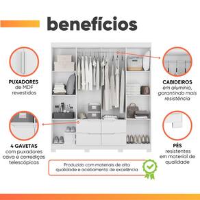 O guarda roupas Mirage é a escolha perfeita para quem busca unir design moderno e elegante com funcionalidade no dia a dia. Com um visual sofisticado, ele valoriza o ambiente e se adapta facilmente a diferentes estilos de decoração. Ele oferece amplo espaço de armazenamento, conta com 6 amplas prateleiras, ideais para organizar roupas, caixas e acessórios de forma prática e eficiente. Além disso, possui 4 gavetas com corrediças telescópicas, que garantem abertura suave, maior durabilidade e melhor aproveitamento interno. Para completar, seus pés elevados facilitam a limpeza, permitindo manter o ambiente sempre organizado e higienizado com mais praticidade. Combinação ideal de beleza, organização e funcionalidade para o seu quarto.