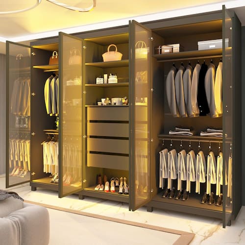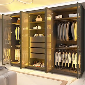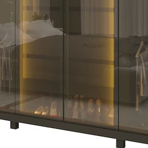 O Roupeiro Absolut Reflecta possui seis portas em vidro reflecta, com molduras em alumínio e LED vertical em cor quente em suas divisórias internas, é uma opção moderna, aconchegante e funcional para sua casa. Com 630mm de profundidade, 4 gavetas espaçosas de corrediças telescópicas, sendo uma com divisórias porta joias.