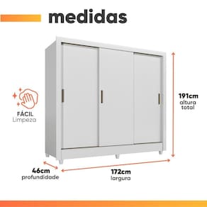 Importante sobre a entrega: A entrega é realizada até a portaria ou porta de entrada do endereço indicado, desde que o acesso seja permitido. Para locais com portaria, a entrega será feita no piso térreo. Não realizamos montagem, desmontagem, transporte por escadas ou içamento. É responsabilidade do cliente verificar se as dimensões do produto são compatíveis com portas, elevadores e corredores. Evite imprevistos: confira todos os detalhes antes de concluir sua compra. MEDIDAS:: [ A ] = 191 cm [ L ] = 172 cm [ P ] = 46 cm | PESO:: 81,05kg | PESO SUPORTADO:: 77kg | PRATELEIRAS SUPORTAM ATÉ:: 8kg | GAVETAS SUPORTAM ATÉ:: 3kg | MODELO:: Guarda Roupas Casal com 3 Portas de Correr 2 Gavetas França | MARCA:: Santos Andirá | ACABAMENTO:: Verniz Brilhante | MATERIAL DA ESTRUTURA:: MDP/MDF | ESPESSURA DO MATERIAL:: 12/15mm | PORTAS:: 3 | TIPO DE PORTA:: Correr | POSSUI ESPELHO:: Não | GAVETAS:: 2 | CORREDIÇA:: Metálicas | PRATELEIRAS:: 5 | MATERIAL DO PUXADORES:: ABS | CABIDEIROS:: 3 | MATERIAL DOS CABIDEIROS:: Alumínio | PÉS:: 6 | MATERIAL DOS PÉS:: PVC | INSTRUÇÕES E CUIDADOS:: Utilizar panos secos ou úmidos, não utilizar produtos abrasivos ou químicos. | SISTEMA DE MONTAGEM:: Parafusos, Cavilha, Minifix. | GARANTIA:: 3 Meses. | AVISO:: Importante sobre a entrega: A entrega é realizada até a portaria ou porta de entrada do endereço indicado, desde que o acesso seja permitido. Para locais com portaria, a entrega será feita no piso térreo. | Altura: 191 | Inclui manual de montagem: Sim | Largura: 172 | Materiais da estrutura: MDP | Profundidade: 46 | Requer montagem: Sim | Cor: Branco