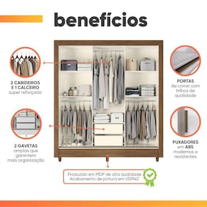 O guarda roupas França é a perfeita escolha para quem busca funcionalidade e um design moderno. Com puxadores em ABS, ele garante um visual clean e elegante, os pés em PVC proporcionam estabilidade e durabilidade ao móvel. As gavetas internas com corrediças metálicas possuem um deslizamento suave e eficiente, ideais para organizar roupas e acessórios com facilidade. Os cabideiros, proporcionam amplo espaço para pendurar suas roupas, mantendo bem organizado. As amplas prateleiras para armazenar roupas e até outros objetos pessoais, otimizando o uso do espaço disponível. As portas de correr, equipadas com trilho metálico de alumínio, garantem um movimento suave, facilitando o uso diário sem ocupar espaço extra, o que é ideal para ambientes menores. Este modelo é a opção perfeita para quem deseja um guarda roupas com design sofisticado e prático no dia a dia.