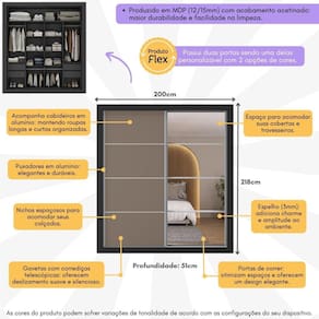 Especificações técnicas: Altura 218cm | Largura 200cm | Profundidade 51cm Material: MDP (12/15mm) Acabamento: Acetinado (cerca de 20% de brilho) Puxadores/Cabideiros: Alumínio Possui Espelhos: Sim Corrediças: Telescópicas