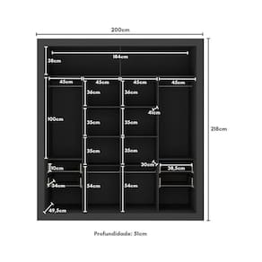 Especificações técnicas: Altura 218cm | Largura 200cm | Profundidade 51cm Material: MDP (12/15mm) Acabamento: Acetinado (cerca de 20% de brilho) Puxadores/Cabideiros: Alumínio Possui Espelhos: Sim Corrediças: Telescópicas