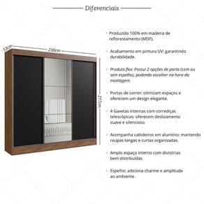 Produzido 100% em MDF (12/15mm) proveniente de reflorestamento com acabamento com pintura UV, este guarda-roupa garante durabilidade e sofisticação. Suas 3 portas de correr são ideais para otimizar espaços e oferecem ampla capacidade de organização. A porta central é Flex: escolha, na hora da montagem, entre um design clean sem espelhos, ou com espelhos que criam uma sensação de amplitude no ambiente. Os puxadores perfil são discretos e práticos na hora de abrir e fechar as portas.