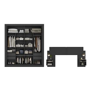 Amplo espaço interno e sofisticação: O guarda-roupas também possui puxadores de alumínio elegantes, cabideiros (até 3 kg) para roupas longas e curtas, nichos generosos para roupas e calçados, além de um espaço superior pensado para cobertores e travesseiros, completando o seu quarto da melhor forma possível.