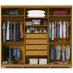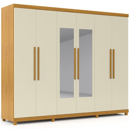 Estrutura: 100% MDFAcabamento: Pintura U.VPrateleiras: Sim, para melhor organização Gavetas: Sim, 04 gavetas internas com corrediças telescópicasCabideiros: Sim, 04 Tubos cabideiros para maior comodidade Puxadores: Sim, 06 puxadores exclusivos em MDFPés: Sim, pés incluso, montagem opcional com ou sem os pésEspelho: Sim, fixados nas portasDimensões do produto montado