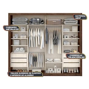 O guarda roupa Imperador tem excelentes repartições e amplo espaço para você organizar as suas roupas, edredons, travesseiros e calçados. Moderno e elegantes, tem duas portas de correr e seis gavetas, sendo a primeira gaveta de cada lado com colmeia para organizar objetos pessoais. O guarda roupa Imperador reúne harmoniosamente beleza, qualidade e durabilidade.