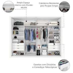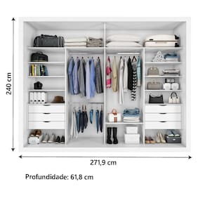 Certifique-se de tudo antes de finalizar a compra, evitando assim futuros desagrados ou imprevistos com a . MEDIDAS:: [ A ] = 240 cm [ L ] = 271,9 cm [ P ] = 61,8 cm | PESO SUPORTADO:: 81kg | PESO:: 257kg | GAVETAS SUPORTAM ATÉ:: 03kg | PRATELEIRAS SUPORTAM ATÉ:: 05kg | CABIDEIROS SUPORTAM ATÉ:: 08kg | MODELO:: Guarda Roupas Casal Ripado 2 Portas de Correr 6 Gavetas | MARCA:: Zanzini | COR:: Branco | MATERIAL:: MDP 15mm | PINTURA:: Texturizado | ACABAMENTO:: Fosco | PORTAS:: 02 | TIPO DE PORTA:: Correr | GAVETAS:: 06 | PRATELEIRAS:: 06 | CABIDEIROS:: 03 | MATERIAL DOS CABIDEIROS:: Metálico | PÉS:: Não possui | POSSUI SAPATAS:: Sim, sapatas plásticas | CORREDIÇAS:: Telescópicas | ITENS INCLUÍDOS:: 01 Guarda Roupas, 01 manual de montagem e Kit parafusos | DIFERENCIAL:: Duas gavetas com divisórias organizadoras e detalhe ripado | GARANTIA:: 03 Meses | AVISO:: A Esplanada Móveis se responsabiliza pela dos produtos adquiridos até a porta de entrada ou portaria do indicado, se a portaria do condomínio permitir, as são efetuadas no piso térreo e é de responsabilidade do cliente. | MATERIAS DA ESTRUTURA: MDP | LARGURA: 271,9 | ALTURA: 240 | PROFUNDIDADE: 61,8 Cor: Branco