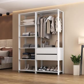 Amplo espaço interno e elegância: O closet é equipado com 7 prateleiras espaçosas (suportam até 8kg em cada), ideais para acomodar suas roupas e calçados favoritos com estilo e organização inigualáveis. O cabideiro de madeira revestido garante que suas roupas, sejam longas ou curtas, fiquem sempre impecáveis. Além disso, com 2 gavetas que possuem corrediças metálicas, o manuseio dos seus pertences ganha leveza e praticidade. Valorize cada peça do seu vestuário com um design aberto e moderno que realça qualquer espaço.