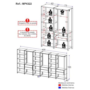 Especificações Técnicas: Dimensões do Produto Montado - Altura: 183cm | Largura: 405cm | Profundidade: 45cm Material: MDP 15mm Acabamento: Acetinado Quantidade de Prateleiras: 21 Quantidade de Gavetas: 6 Corrediças: Metálicas