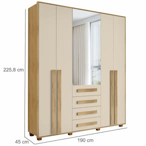 Estrutura: MDP/MDF, moldura de 20 mm de espessuraAcabamento: Pintura U.V, de alta qualidade, acabamento interno na cor do produtoPorta: Sim, 05 portas com dobradiças metálicas, sendo 01 porta com espelhoGaveta: Sim, 04 gavetas com corrediças telescópicasEspelho: Sim, 01 porta com espelhoPuxador: Sim, em MDFPrateleira: Sim, 03 prateleirasMaleiro: Sim, 03 maleirosPés: Sim, 08 pés em PVC maior segurança e durabilidadeDimensões do produto montado