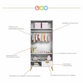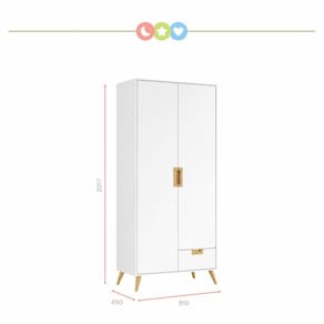 Guarda-roupas Infantil 2 Portas 1 Gaveta Caring Serpil Baby se destaca pelas linhas retas, inspiradas no conceito retrô. Ele é perfeito para ambientes compactos, porém possui um amplo compartimento interno que permite organizar roupas e calçados, de uma forma bem prática. Sua prateleira móvel inferior se ajusta a necessidade de armazenamento de roupas mais longas, é altamente durável devido a composição de MDF combinada com os pés de madeira maciça reflorestada, que prolongam por muito tempo seu uso. Os puxadores de madeira usinados e embutidos nas portas e gaveta, proporcionam uma pegada mais leve. Sua coloração em branco acetinado atóxico combinado com os detalhes em madeira maciça, faz esse móvel se encaixar em qualquer ambiente. Não deixe de conhecer os demais itens desta linha. Acabamento da Prateleira: Pintura UV Escala de Brilho da Prateleira: Semi-Brilho Possui Cabideiros: Sim Acabamento da Gaveta: Pintura UV Escala de Brilho da Gaveta: Semi-Brilho Tipo de Corrediça: Metálica Telescópica Possui Organizador de Gaveta: Não Acabamento da Porta: Pintura UV Escala de Brilho da Porta: Semi-Brilho Acabamento dos Pés: Pintura Altura dos Pés: 13,5 cm Altura Máxima dos Pés: 13.5000 Ambiente Principal: Quarto Infantil codigo_ean: 7908506288935 Complexidade da Montagem: Média: pode ser montado por mais de uma pessoa e/ou necessite de maior conhecimento para montagem Cor: Branco/Carvalho Cor do Produto: Branco/Carvalho Cor Interna: Branco Escala de Brilho: Semi-Brilho Itens Inclusos: 1 Guarda-roupa, kit ferragens e manual de montagem Linha ou Coleção: Caring Manual de Montagem e Instalação: https://product-hub-prd.madeiramadeira.com.br/707870/documents/85283d36-bf80-4318-ae84-a9abb40b21eemontagemroupeiro2p1gcaring.pdf Material da Gaveta: MDF Material da Porta: MDF Material da Prateleira: MDF Material dos Pés: Madeira Maciça Material Principal: MDF Necessita Montagem: Sim Origem do Produto: Nacional Peso: 60,9 kg Peso Máximo por Gaveta: 5 kg Peso Máximo por Prateleira: 10 kg Possui Calceiros: 01 Possui Espelho: Não Possui Pés: 05 Possui Portas: Sim Possui Prateleiras: Sim Produto Montado: Sim Recomendações de Uso, Manutenção e Limpeza: Flanela levemente umedecida Sistema de Montagem: Cavilhas, Parafusos e Minifix Suporta Até (kg): 40 kg Tipo de Corrediça da Gaveta: Metálica Telescópica Tipo de Dobradiça/Corrediça da Porta: Metálica Tipo de Gaveta: Externa Tipo de Guarda-Roupa: Infantil Tipo de Madeira Maciça dos Pés: Pinus Tipo de Puxador da Porta: Embutido Ean: 7908506288935