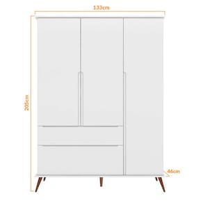 Construído com 100% MDF, este guarda-roupas é robusto e durável, pronto para resistir ao uso diário. Com três portas espaçosas e duas gavetas equipadas com corrediças telescópicas, oferece amplo espaço de armazenamento para roupas, calçados e acessórios. Além disso, possui um prático cabideiro para pendurar roupas.