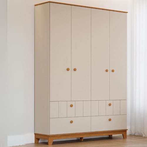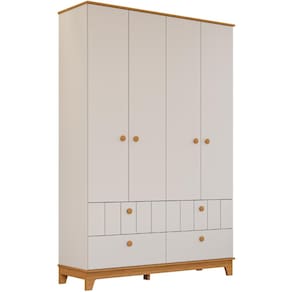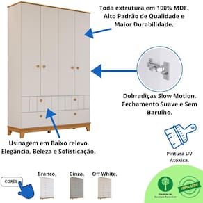 FICHA TÉCNICA Altura: 218 cm Largura: 148 cm Profundidade: 47,3 cm Quantidade de Gavetas: 04 Gavetas (Peso suportado 3Kg) Quantidade de Portas: 04 Portas Material: 100% MDF Acabamento do Produto: Pintura UV Atóxica Semi-Fosco; Tipo de Corrediça: Corrediça Telescópica Tipo de Puxadores: MDF revestido Tipo de Pés: MDF ( Altura 10cm);