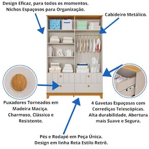 D - Como organizar a Guarda Roupa Infantil Estilo Retrô? Você vai naturalmente encontrar a melhor maneira de organizar seu Guarda Roupa. Entretanto, vale a pena pontuar algumas situações: 1-A Guarda Roupa deve estar sempre limpo*; 2-Primeira Gaveta: Utilize para os produtos de Higiene do bebê; 3-Demais Gavetas: Utilize para roupas e acessórios do bebê. 4-Nos cabides as roupas maiores e roupas com usos menos frequentes e nos nichos e prateleiras artigos e objetos de uso diários.