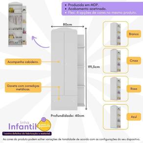 - 2 portas com dobradiças metálicas: amplo espaço para guardar roupas e acessórios. - Puxadores em ABS. - 1 gaveta com corrediças metálicas: maior leveza no manuseio. - 4 prateleiras externas: perfeitas para organizar brinquedos ou objetos decorativos, embelezando o quarto. - Com cabideiro (suporta até 3kg): maior organização e praticidade na hora de guardar as roupas. - Flex com 4 opções de cores no mesmo produto: escolha o que melhor combinar com seu ambiente durante a montagem.