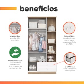 O Guarda Roupa Infantil Magia foi desenvolvido para oferecer praticidade e organização ao quarto das crianças, unindo beleza e funcionalidade. Seu design moderno conta com amplo espaço interno, cabideiro em alumínio reforçado e prateleiras bem distribuídas, ideais para manter roupas, acessórios e brinquedos sempre em ordem. Possui 2 gavetas com corrediças telescópicas que garantem abertura suave e durabilidade, além de nichos externos que permitem decorar e expor itens de forma charmosa. Os puxadores arredondados em ABS proporcionam mais segurança e praticidade no dia a dia. Produzido com materiais de alta qualidade e madeira reflorestada, o Guarda-Roupa Infantil Magia é resistente, funcional e pensado para acompanhar o crescimento e as necessidades da criança, trazendo mais conforto e organização ao ambiente.