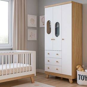 Ambas as variações mantêm a mesma cor e estrutura, oferecendo 3 portas, 4 gavetas com corrediças metálicas e puxadores arredondados em madeira. Ideal para organizar roupas, fraldas, brinquedos e outros itens essenciais do bebê ou da criança.