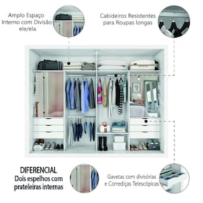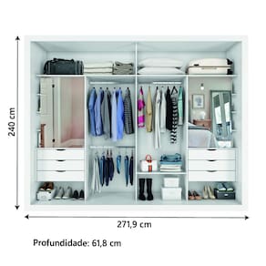 MEDIDAS: [ A ] = 240 cm [ L ] = 271,9 cm [ P ] = 61,8 cm MEDIDAS ESPELHO: [ A ] = 103 cm [ L ] = 56,6 cm PESO SUPORTADO: 81kg PESO: 257kg GAVETAS SUPORTAM ATÉ: 03kg PRATELEIRAS SUPORTAM ATÉ: 05kg CABIDEIROS SUPORTAM ATÉ: 08kg MODELO: Guarda Roupas Ripado Casal Com Espelho Interno 2 Portas de Correr 6 Gavetas Coliseu MARCA: Zanzini COR: Branco MATERIAL: MDP 15mm PINTURA: Texturizado ACABAMENTO: Fosco PORTAS: 02 TIPO DE PORTA: Correr GAVETAS: 06 PRATELEIRAS: 06 CABIDEIROS: 03 MATERIAL DOS CABIDEIROS: Metálico PÉS: Não possui POSSUI SAPATAS: Sim, sapatas plásticas CORREDIÇAS: Telescópica ITENS INCLUÍDOS: 01 Guarda Roupas, 01 manual de montagem e Kit parafusos DIFERENCIAL: Duas gavetas com divisórias organizadoras, dois espelhos internos e detalhe ripado. GARANTIA: 03 Meses