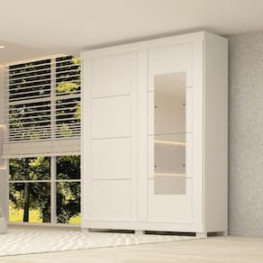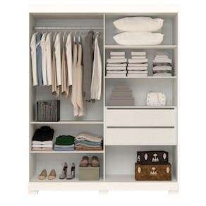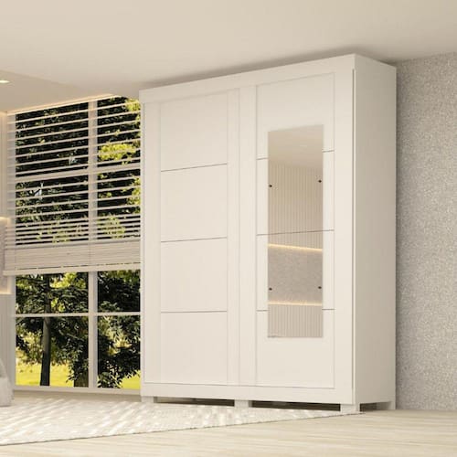 Características: Estrutura em MDF 12mm Pintura interna linho 2 Portas de correr 2 Gavetas com divisórias Corrediças telescópicas Prateleiras suportam até 5kg Cabideiro em alumínio Pés inclusos