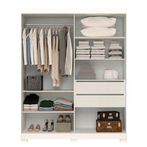 Características: Estrutura em MDF 12mm Pintura interna linho 2 Portas de correr 2 Gavetas com divisórias Corrediças telescópicas Cabideiro em alumínio Pés inclusos