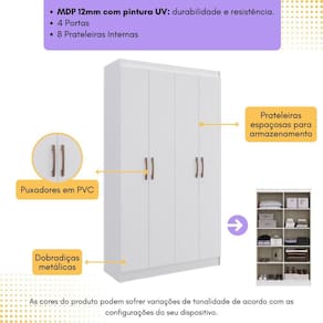 O Guarda-Roupas 4 Portas Multimóveis CR35216 é a escolha perfeita para quem busca qualidade e funcionalidade. Produzido em MDP com acabamento acetinado, este guarda-roupas oferece durabilidade e elegância. Com prateleiras internas que suportam até 5kg cada, você terá amplo espaço para organizar suas roupas e acessórios de forma prática. Os puxadores em PVC garantem praticidade no dia a dia, enquanto o design clean adiciona um toque moderno ao ambiente.
