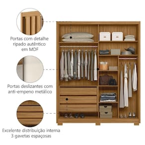 DIFERENCIAL: 2 portas de correr sendo 1 com espelho, 3 gavetas para melhor armazenamento, amplo espaço interno, acabamento fosco, detalhes em ripado autêntico.