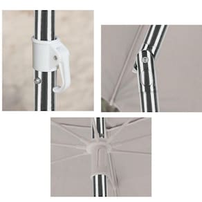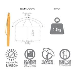 Possui saída de ar no topo que auxilia na estabilidade e sua haste em alumínio vem com tem alavanca e duplo pino de fixação, o que garante maior segurança evitando que a parte superior do guarda-sol se solte. O guarda-sol é articulável, permitindo que você ajuste a posição como preferir.