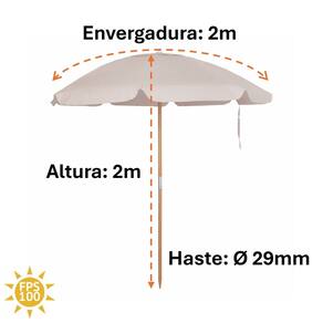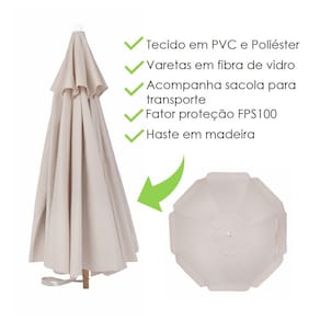 Guarda sol: Material: Madeira Cor Predominante: Bege Medidas e peso: Base plástica: Material: Polipropileno Capacidade: 18l de água ou 22kg de areia Medidas guarda sol: (Envergadura) 2,00m x (Alt.) 2,02m Haste: Ø 28mm Peso: 2,15 kg