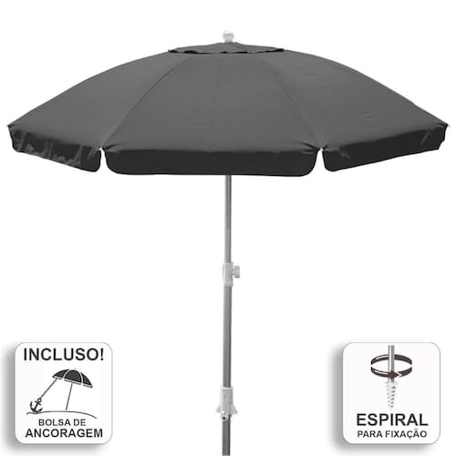 Acompanha Kit de Fixação/Ancoragem. Reforçado e com design diferenciado, chama atenção por sua elegância. Projetado com uma estrutura em alumínio reforçado e varetas em fibra de vidro que garantem resistência aos efeitos da corrosão. As 8 varetas em fibra de vidro com espessura de 5 mm garantem robustez ao produto. Possui saída de ar no topo que auxilia na estabilidade e sua haste em alumínio vem com sistema de fixação em espiral. Sua cobertura com fator de proteção solar UV 50+ é feita com tecido em poliéster com camada de silver coating. Acompanha bolsa de transporte. Prático, resistente, bonito e leve.