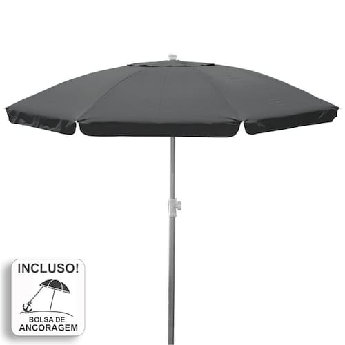 Acompanha Kit de Fixação/Ancoragem. Reforçado e com design diferenciado, chama atenção por sua elegância. Projetado com uma estrutura em alumínio reforçado e varetas em fibra de vidro que garantem resistência aos efeitos da corrosão. As 8 varetas em fibra de vidro com espessura de 7.9 mm garantem robustez ao produto. Possui saída de ar no topo que auxilia na estabilidade e a haste em alumínio. Sua cobertura com fator de proteção solar UV 50+ é feita com tecido em poliéster com camada de silver coating. Acompanha bolsa de transporte. Prático, resistente, bonito e leve.