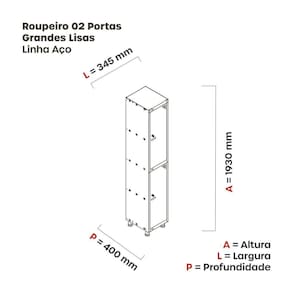 Armário Roupeiro de Aço totalmente montável, dispensa a utilização de parafusos, estrutura em chapas #24 e #26 (0,60mm e 0,45mm) conta com uma porta com estampos circulares em formação triangular para ventilação, sistema de fechamento de varão de 3 pontos, através de pitão para cadeado. Acabamento da Porta: Pintura Ambiente Principal: Banheiro Complexidade da Montagem: Média: pode ser montado por mais de uma pessoa e/ou necessite de maior conhecimento para montagem Cor: Laranja Picasso Cor do Produto: Laranja Picasso Cor Interna: Cinza Escala de Brilho: Semi-Fosco Escala de Brilho da Porta: Semi-Brilho Itens Inclusos: 1 Armário, Kit Ferragens e Manual de Montagem Manual de Montagem e Instalação: https://cdn2.madeiramadeira.com.br/atributo/pandin/889145-11-3416-0121.pdf Material da Porta: Aço Material dos Pés: Polipropileno Material Principal: Aço Necessita Montagem: Sim Origem do Produto: Nacional Pés Reguláveis: Sim Peso: 14.9 Possui Espelho: Não Possui Pés: 04 Possui Portas: 02 Possui Prateleiras: Não Recomendações de Uso, Manutenção e Limpeza: Utilizar um pano levemente umedecido com água, para finalizar utilizar um pano seco. Sapatas Niveladoras: Não Sistema de Montagem: Parafuso Suporta Até (kg): 15 Tipo de Dobradiça/Corrediça da Porta: Aço Tipo de Puxador da Porta: Externo
