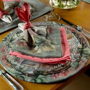 O guardanapo é um item essencial para compor a decoração e garantir funcionalidade. Ele pode ser utilizado para limpar as mãos ou os lábios durante as refeições, além de trazer um toque de elegância e organização. O guardanapo pode ser dobrado de maneira simples ou decorativa, e colocado no centro do prato, ao lado dos talheres ou em porta-guardanapos, complementando o estilo e a harmonia da mesa.