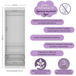 Dimensões do Produto Montado: Altura: 184cm | Largura: 62cm | Profundidade: 41cm *Você pode consultar as medidas detalhadas na imagem técnica do produto.