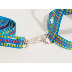 Peitoral de nylon 25 mm quadriculado azul com fivela de metal; Guia de nylon 25 mm azul quadriculado; Mosquetão com trava de segurança; Cor azul. Tamanho: nº 4. Praticidade, conforme para seu pet de pequeno a médio porte. Passei com estilo e elegância. Medidas aproximadas: Pescoço 44 cm Tórax 46 à 51 cm. Guia 90 cm. Marca: Nica pet