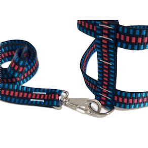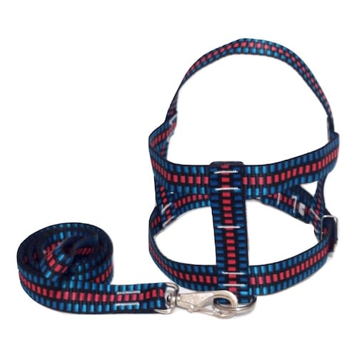 Peitoral de nylon 25 mm quadriculado preto com fivela de metal; Guia de nylon 25 mm preto quadriculado; Mosquetão com trava de segurança; Cor azul. Tamanho: nº 4. Praticidade, conforme para seu pet de pequeno a médio porte. Passei com estilo e elegância. Medidas aproximadas: Pescoço 44 cm Tórax 46 à 51 cm. Guia 90 cm. Marca: Nica pet