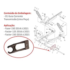 Guia Corrente Transmissão Fazer 150/ Factor 150/ Factor 125 As guias de corrente são peças essenciais para deter impactos na sua transmissão, assim gerando resistência e maior durabilidade. Evitando assim que durante a pilotagem em locais e situações de maiores trepidações a corrente se mantenha no lugar, mantendo a transmissão trabalhando normalmente. Evite a flutuação e eventual desengrenagem do sistema corrente/coroa, aumentando assim a vida útil das peças móveis e eliminando os riscos de falha mecânica Conteúdo da Embalagem: - 01 Guia Corrente Transmissão Uma Peça Aplicação: - Fazer 150 2014 á 2021 - Factor 125 2016 á 2021 - Factor 150 2016 á 2021 Materia: - Borracha Estado: - Novo Marca: Rr Racing Ean: 7908664921675