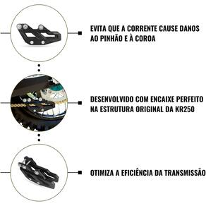 Este produto guia a corrente na coroa e evita que seu desalinhamento cause danos à transmissão da moto, aumentando a vida útil e a fluidez do conjunto.