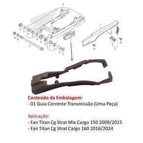 Guia Deslizador Corrente Transmissão Cg Fan Titan 150 160 As guias de corrente são peças essenciais para deter impactos na sua transmissão, assim gerando resistência e maior durabilidade. Evitando assim que durante a pilotagem em locais e situações de maiores trepidações a corrente se mantenha no lugar, mantendo a transmissão trabalhando normalmente. Evite a flutuação e eventual desengrenagem do sistema corrente/coroa, aumentando assim a vida útil das peças móveis e eliminando os riscos de falha mecânica Conteúdo da Embalagem: - 01 Guia Corrente Transmissão Uma Peça Aplicação: - Fan Titan Cg Strat Mix Cargo 150 2009/2015 - Fan Titan Cg Strat Cargo 160 2016/2024 Material: - Borracha Estado: - Novo Marca: Não Informado