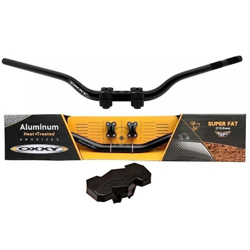 Conheça o Guidão Oxxy com Adaptador + Espuma: Os guidões Oxxy oferecem resistência e performance na pilotagem, permitindo que o piloto possa ir mais rápido e com maior controle sobre a moto, tornando a pilotagem mais confortável. Características do Guidão Oxxy com Adaptador: Fabricado com alumínio 6061-T6 e com 31,75 mm de espessura garante resistência ideal para todas as situações (motrocross ou trilha); Gravação à laser dos ângulos de instalação do guidão; Maior conforto e controle ao pilotar sua moto; Itens inclusos no Guidão Oxxy com Adaptador: Espuma protetora de alta densidade; Adaptador de 31,75 mm em alumínio usinado em maquina CNC 04 Parafusos; Medidas aproximadas do Guidão Oxxy com Adaptador: Largura: 810mm; Diâmetro central: 31,75 mm; Diâmetro nas extremidades: 22,2mm; Altura do modelo Baixo: 85mm; Altura do modelo Alto: 110mm; O Guidão Oxxy Fat Bar é universal, podendo ser instalado em qualquer moto off-road desde que possua um adaptador para tal. Confira as medidas dos guidões OXXY: