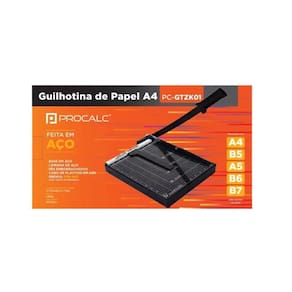 Guilhotina A4 10 Folhas Preta Com Esquadro Magnético Base Aço Características:.Base em aço.Lâminas de aço.Pés emborrachados.Cabo de plástico em abs.Prensa com imã para maior desempenho.Capacidade de corte - 10 folhas a4 75g .Marcações em a4,b5,a5,b6 e b7 para auxiliar no corteEspecificações:.Marca: Procalc.Modelo: PC-GTZK01.Cor: Preto.Condição do item: NovoDimensões:.Peso: 1,80kg.Medidas : 30x25cm