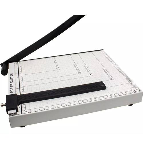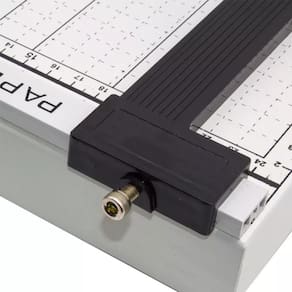 - trava de segurança lateral e cabo com punho em plástico - fixador de papel ajustável - pés emborrachados para maior estabilidade e segurança durante o corte - ideal para trabalhos escolares, escritórios e papelarias