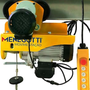 Produto: Guincho Talha elétrica 300/600 kg elevação até 12 m com trole elétrico - Prime Marca: Menegotti Voltagem: 220VDescrição: O Guincho Talha elétrica 300/600 kg elevação até 12 m com trole elétrico Prime da Menegotti é um equipamento projetado para trabalhos de elevação de cargas acionado por motorredutor elétrico e motofreio. Possui capacidade de carga de 300 Kg para elevação de até 12 metros e capacidade de 600 kg para elevação de até 6 metros Para duplicar a capacidade de elevação e elevar a carga máxima permitida deve-se fazer uso do moitão . O Guincho Talha conta trole elétrico que facilita a movimentação horizontal. Equipamento de fácil operação, recomendado para carga e descarga de produtos, oficinas, depósitos, armazém, etc. Este equipamento é a ferramenta ideal para reduzir o esforço físico, aumentando a produtividade e a eficiência do operador, para um bom desempenho do equipamento e para a segurança dos operadores é necessário que seus dispositivos de fixação estejam bem firmes e nivelados.Especificações: Capacidade de elevação de carga: 300/600 kgAltura de elevação: 12 m - 300 kg 6m - 600 kgVelocidade de elevação: 10m/min 300 KG / 5m/min 600 kgPotência: 1500WClasse de isolação: BCabo de aço - diâmetro: 4 mmCabo de aço - Comprimento: 12,5m. Permitido somente com uso do moitão.Para duplicar a capacidade de elevação e elevar a carga máxima permitida deve-se fazer uso do moitão. Especificação técnica do trole elétrico:Potência W : 300Velocidade do trole m/min: 13Raio mínimo para curvatura: 1Largura da viga “I” mm : 68-94 Diâmetro do cabo de aço mm : 4.5.