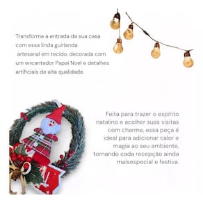 Dê as boas-vindas ao espírito natalino com a nossa Guirlanda Natalina com Papai Noel. Esta peça artesanal é feita em tecido macio e decorada com um encantador Papai Noel de roupa xadrez, detalhes em pelúcia e acabamento rústico, proporcionando um toque acolhedor e exclusivo.