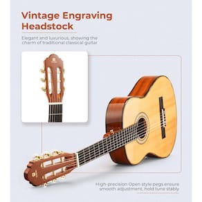 - ? [Ideal para iniciantes]: a guitarra clássica Vangoa possui cordas de nylon macias, botões abertos de alta precisão, uma escala suave, pescoço em forma de C e um afinador de guitarra para uma aderência e pressão confortáveis, bem como afinação mais precisa e estabilidade duradoura, facilitando para iniciantes aprenderem e tocarem