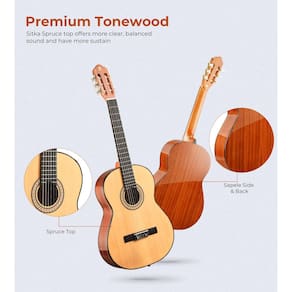 - ? [Excelente madeira e artesanato]: usando tecnologia de aprimoramento de ressonância acústica e uma estrutura estável em forma de X com parte superior de abeto premium e traseira e lateral sapele após até 5 anos de secagem natural, uma guitarra clássica júnior pode fornecer melhor som e qualidade