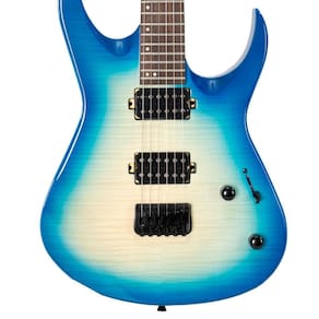 A Waldman WM320F GBR é uma Super Strato na belíssima configuração Black Burst construída com corpo de Poplar com Flamed Top equipado com ponte Tremolo, braço de Maple com escala de Laurel, nut em Black Graphite e tarraxas pretas..
