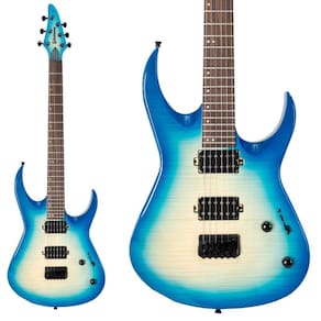 A Waldman WM320F GBR é uma Super Strato na belíssima configuração Black Burst construída com corpo de Poplar com Flamed Top equipado com ponte Tremolo, braço de Maple com escala de Laurel, nut em Black Graphite e tarraxas pretas..