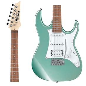 Modelo: GRX40 Construção: Braço parafusado bolt-on Material do Braço: Maple Corpo: Poplar Braço: GRX Escala: Jatobá Tamanho da escala: 25,5 Trastes: 22 Espaçamento das cordas: 10.5mm Ponte: T106 Tremolo Trastes: Médio Ferragens: Cromadas Escudo: Branco Marcação: Dot tipo Ponto Branco Captação: Infinity RS S Braço Passivo/Cerâmico Infinity RS S Meio Passivo/Cerâmico Infinity R H Ponte Passivo/Cerâmico Afinações de fábrica: 1E,2B,3G,4D,5A,6E Cordas: .009/.011/.016/.024/.032/.042 Controles: 1 Volume + 1 Tone e chave de 3 posições Cor: Metallic Light Green MGN Ean: 4515276836551